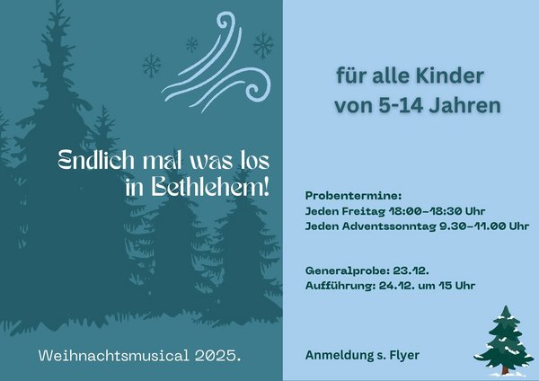 Herzliche Einladung zum Familiengottesdienst an Heilig Abend, 24.12.25 um 15 Uhr mit Weihnachtsmusical.
